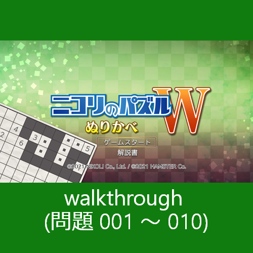 ニコリのパズル シリーズでぬりかべをテーマとしたパズル ゲーム、「ニコリのパズルW ぬりかべ」の 問題 001 ~ 010 までの解答を纏めました。解答内容は、XBOX 版「ニコリのパズルW ぬりかべ」と Windows 版「ニコリのパズル