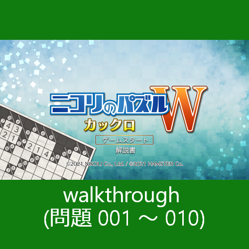 ニコリのパズル シリーズで『カックロ』をテーマとしたパズル ゲーム、「ニコリのパズルW カックロ」の 問題 001 ~ 010 までの解答を纏めました。